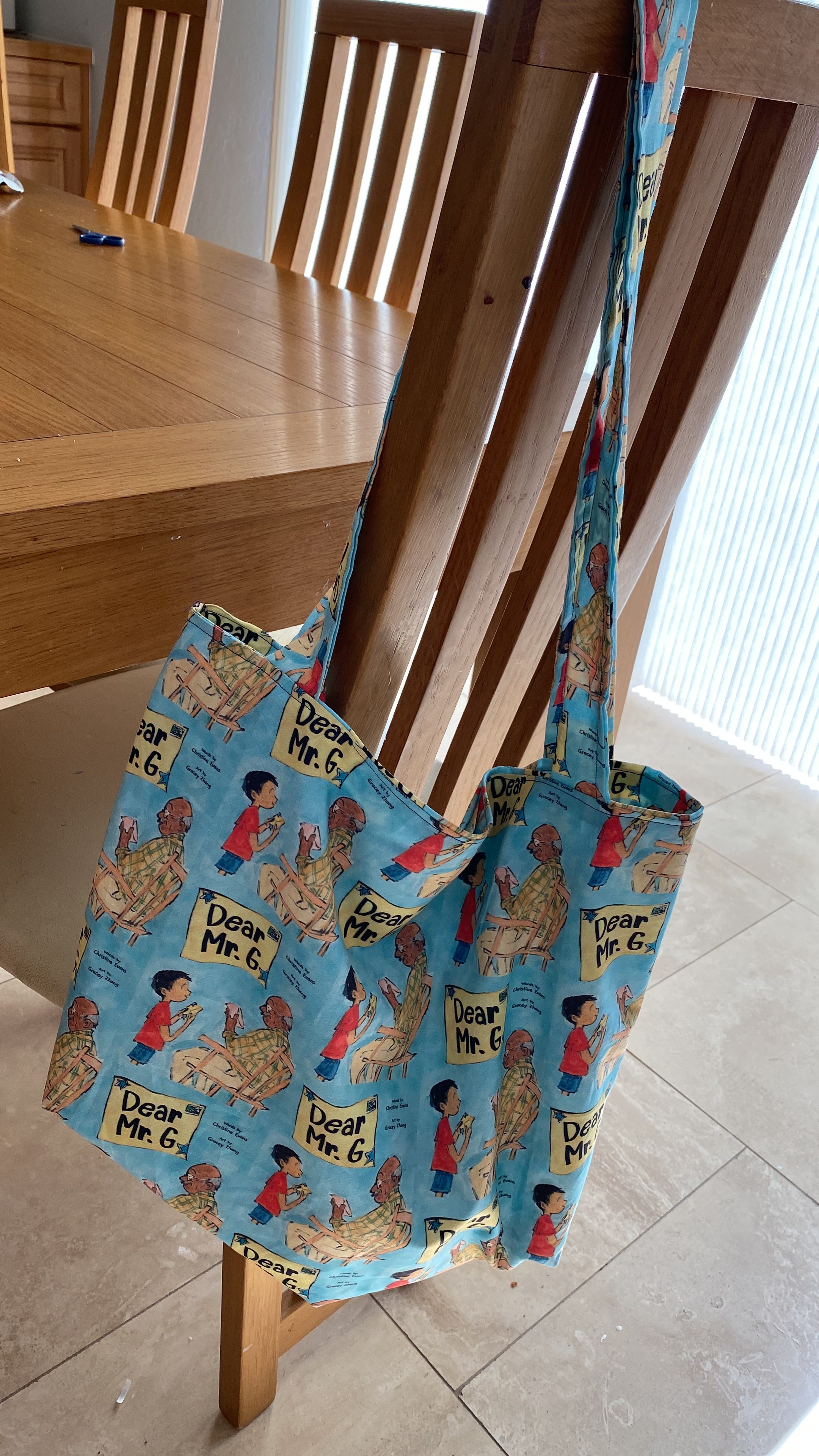 Long-time friends will know I was a massive crafter once upon a time. I crocheted a blanket, sewed quilts, stitched clothes, and made cards. But my trusty old sewing machine had been relegated to a closet for years until I decided, about two weeks before ALA, that I need a custom Dear Mr. G bag. I was inspired by Federico Erebia who made a custom bag for his book, Pedro & Daniel.