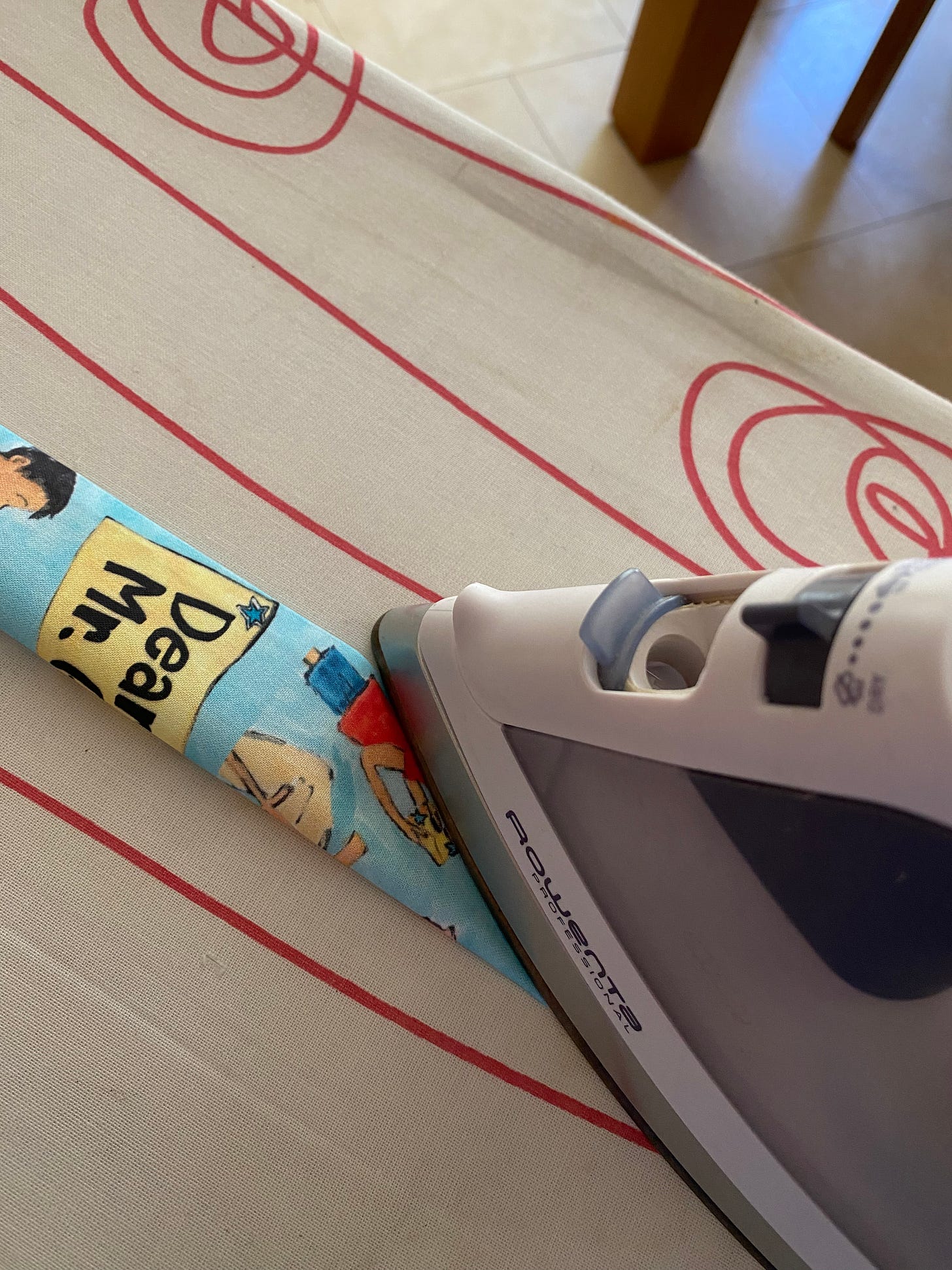 Step 3: Cut the fabric according to your pattern. For the straps I cut two wide straps, folded each long side over a small amount and then folded it in half (again, I didn’t measure so I’m sorry for the imprecise instructions!) The only time I iron anything is when I’m sewing and ironing was essential for this step.